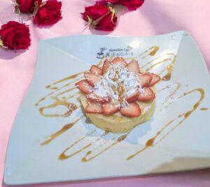 メニューはいっぱいあります。大人気の魔法のパンケーキのプレーン、抹茶のパンケーキ、キャラメルコーヒー、バナナ、小倉、そしてキャラメル苺のパンケーキ!